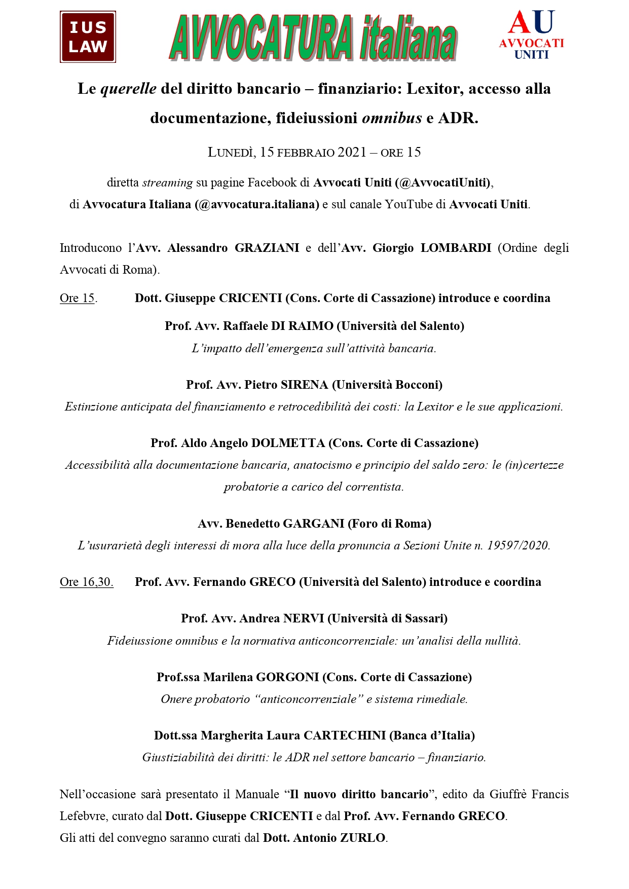 in diretta streaming sulle pagine Facebook di Avvocati Uniti (@AvvocatiUniti), di Avvocatura Italiana (@avvocatura.italiana) e sul canale YouTube di Avvocati Uniti.