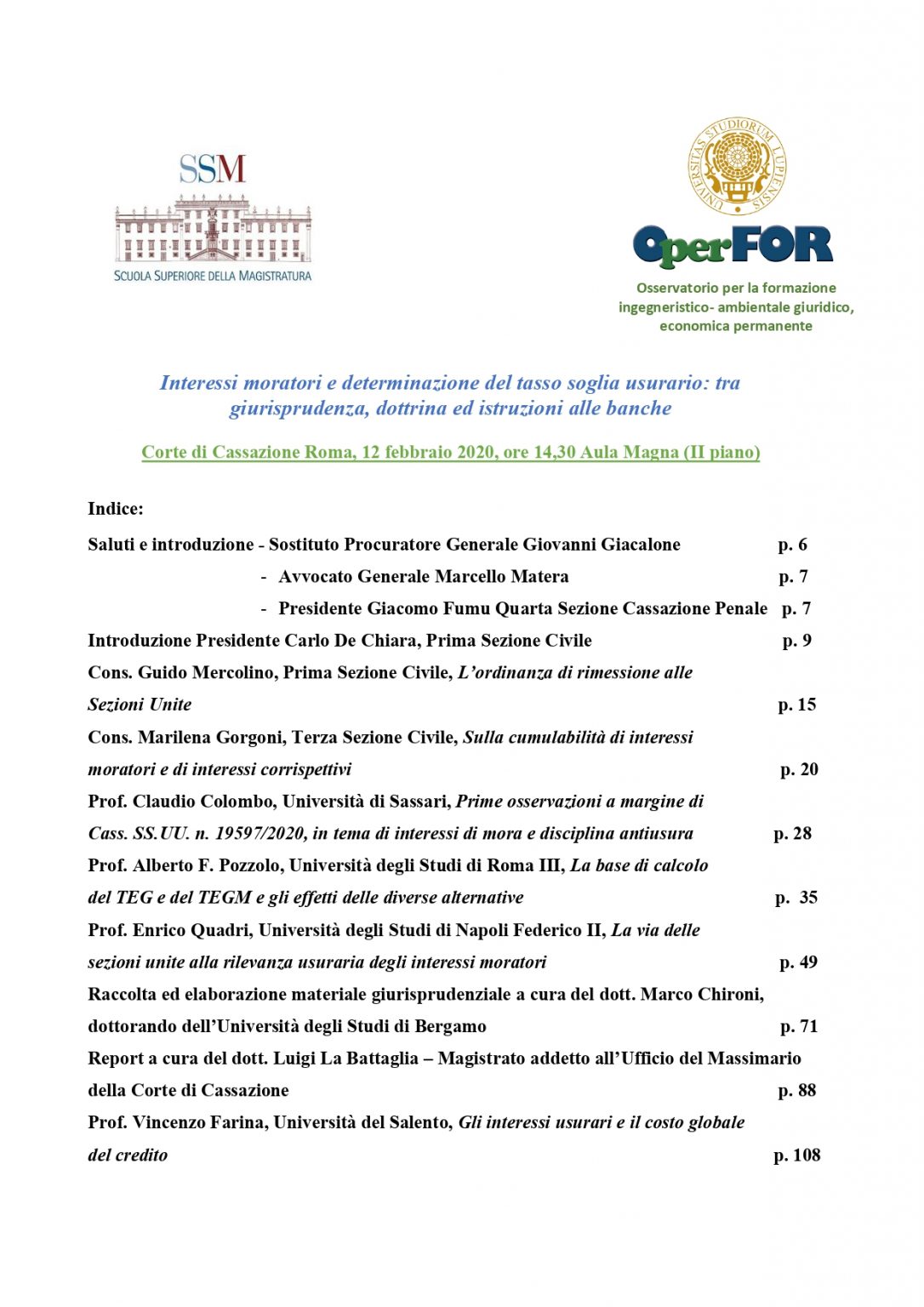 Si pubblicano gli Atti del Convegno “Interessi moratori e determinazione del tasso soglia usurario: tra giurisprudenza, dottrina ed istruzioni alle banche”, tenutosi nell’Aula Magna della Suprema Corte di Cassazione, il 12 febbraio 2020, in edizione aggiornata con contributi a margine della sopravvenuta pronuncia delle Sezioni Unite Civili n. 19597/2020.