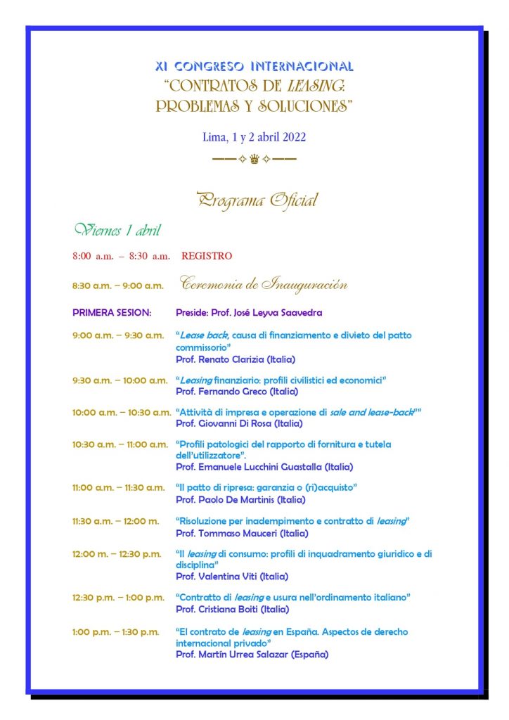 Nella sessione del 1 aprile, relazionerà il Prof. Fernando GRECO, nostro Direttore Scientifico, con un intervento su “Leasing finanziario: profili civilistici ed economici”.