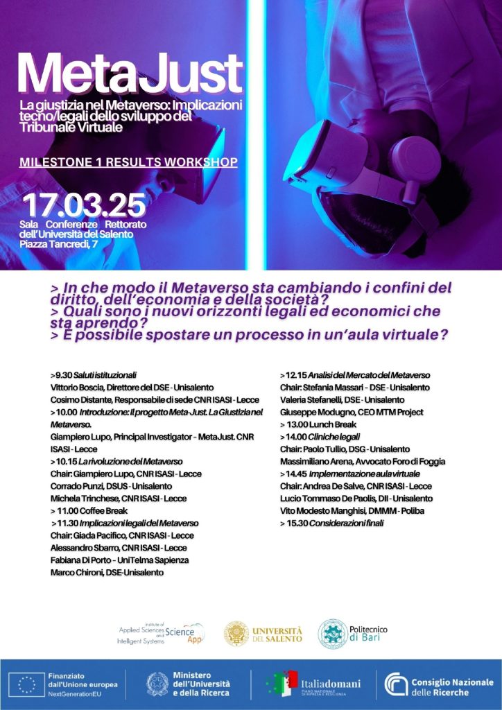 MetaJust – La giustizia nel Metaverso: implicazioni tecno/legali dello sviluppo del Tribunale Virtuale (Lecce, 17 marzo 2025)